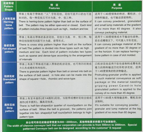 花紋輸送帶是由帶體和花紋部分組成,由于運(yùn)送的物料和輸送機(jī)傾角大小的不同,要求花紋的形狀和高低(深淺)也不同。
